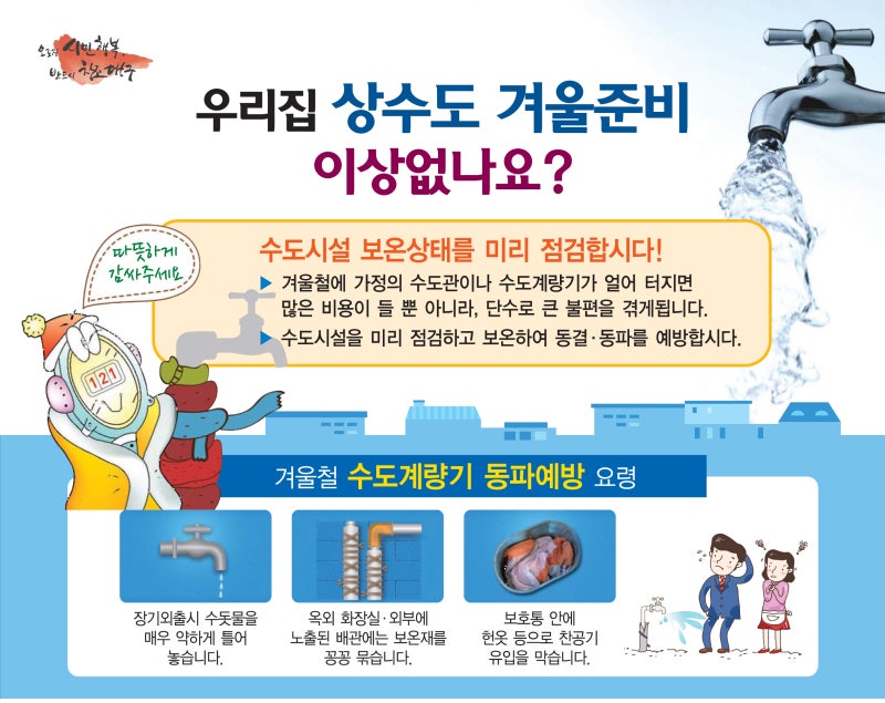 귀하의 집에 물 공급은 겨울을 대비할 준비가 되어 있습니까? 겨울철 수도계량기 동파방지 요령과 급수시설 단열상태도 미리 확인해보세요!