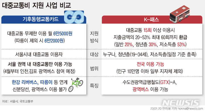 기후 동반자 카드기후 동반자 카드기후 동반자 카드는 수도권 내 모든 대중교통과 따릉이를 무제한으로 이용할 수 있는 교통패스입니다. 서울시가 환경 문제를 고려하여 대중교통 이용을 장려하기 위해 만든 것으로, 기후 동반자 카드라는 이름이 붙었습니다. 2024년 1월에 출시될 예정이며, 모바일 카드 또는 실물 카드 중 선택하여 사용할 수 있습니다. : 설명 : 기후 동반자 카드 설명 1회 충전 62,000원으로 30일간 서울 대중교통을 무제한으로 이용할 수 있습니다(따릉이 포함은 65,000원). 서울 지하철, 시내버스 및 마을버스(심야버스 포함), 따릉이를 자유롭게 이용할 수 있습니다. 기후 동반자 카드는 모바일(안드로이드) 또는 실물 카드로 구매할 수 있으며, 실물 카드는 지하철역, 편의점, 서울메트로에서 구매할 수 있습니다. : 신청방법 : 기후동반카드 신청방법 1. 모바일 티머니 앱 설치 2. 기후동반카드 선택 3. 기후동반카드 발급 4. 회원가입 및 이용약관 동의 5. 카드종류 선택 6. 이용시작일 선택 및 충전 K-PASS K-PASS K-PASS K-PASS 카드는 기존 알뜰카드를 대체하는 카드라고 합니다. 기존 알뜰카드를 이용하면서 불편했던 점은 마일리지 적립이 출발·도착 거리에 따라 적립돼 앱에서 직접 입력해야 했다는 점이었습니다. K-PASS는 거리 기반 마일리지 적립을 금액 기반 마일리지 적립으로 변경했다고 합니다. 이 외에도 K-PASS에는 신분당선, 광역버스, GTX, 마을버스, 농촌버스가 포함됩니다. : 설명 : K-PASS K-PASS 설명 버스요금 1,500원 기준으로 기본요금 300원, 청소년 450원, 저소득층 795원을 절약할 수 있으며 이는 다음 달에 환불됩니다. 다만, 월 15회 이상 사용해야 하며 혜택은 최대 60회까지 제공됩니다. 선불충전카드, 후불수표, 신용카드와 함께 사용할 수 있으며, 1회당 1,500원을 60회 사용하면 청소년은 사용금액의 30%인 27,000원을 환불받을 수 있습니다. 또한, 각 카드사별로 교통비 10% 할인 혜택이 제공될 수 있습니다. : 신청방법 : K-PASS 신청방법 1. 기존 경제교통카드 이용자라면 경제교통카드 앱이나 누리집에서 멤버십 전환 신청 2. K-PASS 신규 가입자라면 각 은행에서 발급한 K-PASS 앱이나 누리집에서 신규 멤버십 가입 기후카드 비교 K-PASS 기후카드 비교 K-PASS 서울 시민의 관점에서 살펴보겠습니다. 저는 서울에서 출퇴근 시 대중교통을 많이 이용하고, 한 달에 53회 이상 대중교통을 이용합니다. 저는 따릉이를 자주 이용합니다. 기후동반카드를 선택하는 것이 유리합니다. 반면 서울에 살면서 경기, 인천으로 출퇴근하는 경우 신분당선과 시외버스를 제외하면 기후동반카드보다 K-PASS의 혜택이 더 좋습니다. 저의 경우 서울 지하철 5호선에서 신분당선으로 환승합니다. 월평균 교통비가 7만8천원이 넘습니다. 신분당선을 이용하지 않고 서울지하철만 이용했다면 기후동반카드 혜택이 더 유리했을텐데, 신분당선과 광역버스는 혜택이 없으니 케이패스가 더 유리해서 케이패스를 취득하고 싶습니다. 기후동반카드와 케이패스를 비교해보았습니다. 금전적 혜택은 비슷하겠지만 출발지와 이용 교통수단, 이용 빈도를 파악한다면 조금 더 경제적으로 대중교통을 이용할 수 있으니 오늘의 글을 참고하셔서 교통비를 줄이시기 바랍니다. 0초 0초 광고 후 계속됩니다. 다음 영상 주제 작성자 취소 기후 동반자 카드 K-Pass 비교 신청 혜택 설명 재생 11 좋아요 5 좋아요 공유 재생(스페이스/k) 재생 00:45 0:00:00 재생(스페이스/k) 재생 음소거(m) 음소거 00:00 / 00:45 실시간 설정 전체 화면(f) 해상도 자동 480p 자막 비활성화 재생 속도 1.0x(기본값) 해상도 자동(480p) 1080p HD 720p HD 480p 270p 144p 자막 설정 비활성화 옵션 글꼴 크기 배경색 재생 속도 0.5x 1.0x(기본값) 1.5x 2.0x 알 수 없는 오류가 발생했습니다. 도움말 음소거되었습니다. 도움말 라이선스 이 영상은 고화질로 재생할 수 있습니다. 설정에서 해상도를 변경해 보세요. 자세히 알아보기 00:00 접기/펼치기Climate Companion Card K-Pass 비교 신청 혜택 설명 #Climate Companion Card #KPASS #K-Pass #Climate Companion Card K-Pass 비교 #Climate Companion Card K-Pass #Climate Companion Card K-Pass 혜택 #Climate Companion Card 혜택 #K-Pass 혜택