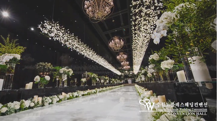 버진로드 양쪽에는 풍성한 꽃 장식은 물론 캔들 장식도 있었고, 그 옆에는 고급스러운 게스트 테이블이 배치돼 마치 대연회장 같은 느낌을 주었다. (참고로 버진로드만 해도 길이가 30미터나 됩니다.)