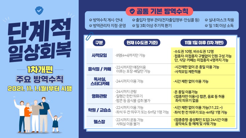 더 나은 내일의 대한민국. 일상생활의 단계적 회복. 국민 여러분의 적극적인 백신 접종 참여와 의료진, 관계자들의 노고에 힘입어 11월 1일부터 단계적인 일상 회복을 시작하겠습니다. 더 나은 내일의 대한민국을 지향합니다. 시민의 자율성과 책임. 를 바탕으로 방역을 통해 모두의 소중한 일상의 회복을 촉진하겠습니다.