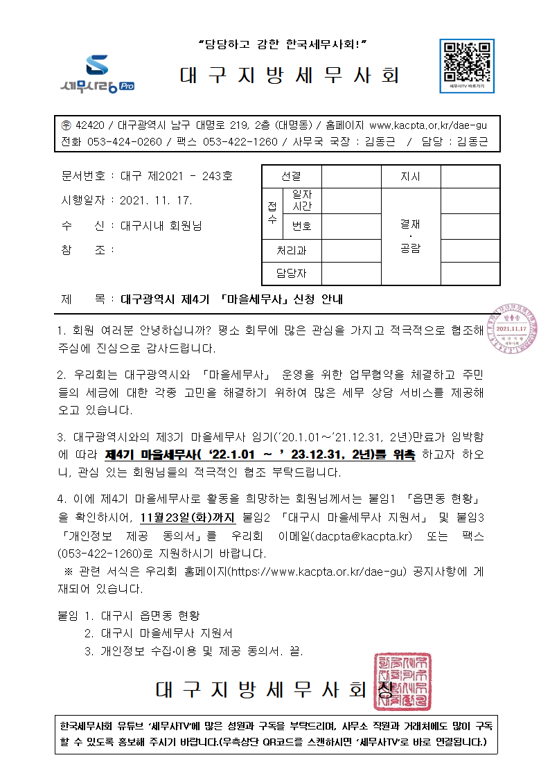 대구북구 세무사 세무회계과정은 사무국장이 없으며, 세무사와의 상담을 통해 모든 세제혜택을 누리면서 세무신고 누락을 방지하여 절세를 도와드립니다.