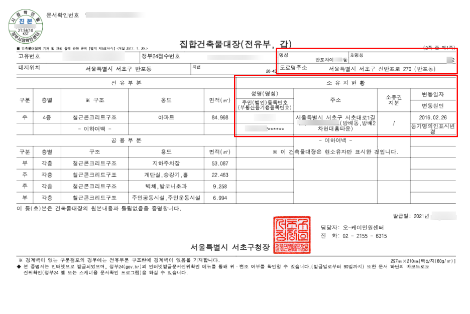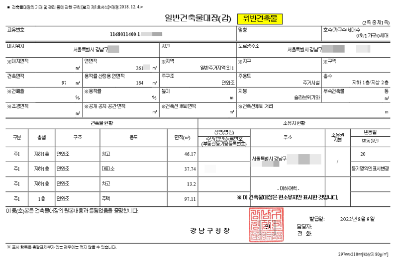 그럼 중요한 부분만 알아보고, 건축물대장에서 어떤 정보를 확인해야 하는지 살펴보도록 하겠습니다. 먼저 위반건축물인지 확인해야 합니다. 문서 제목 옆에 큰 글자로 표시되어 직관적으로 내용을 확인할 수 있습니다. 건물이 위반사항에 해당하는 경우에는 임대보증보험 가입이 불가능하고, 위반사항에 대한 내용이 위임되므로 피해야 합니다. 다음은 지번과 도로명입니다. 제가 거래하려는 건물과 동일한지 나중에 정확한 비교를 해봐야겠습니다. 용도는 다음과 같습니다. 아파트의 경우에는 다세대 주택(아파트)으로 용도가 지정됩니다. 근린생활시설이나 생활숙박시설의 경우에는 임대보증보험 가입이 어려울 수 있으므로 확인이 필요하니 참고하시기 바랍니다. 다음은 소유자 상태입니다. 반드시 차후 거래를 통해 실소유주가 실소유주인지 확인 후 거래를 진행하시기 바랍니다. 지금까지 건축물대장을 무료로 보는 방법을 살펴보았습니다. 부동산 거래를 할 때 건축물대장을 열람하는 것은 기본이고, 그 밖에도 확인하고 공부해야 할 것들이 많습니다. 향후 문제가 생길 경우를 대비해 최소한의 권리를 확보하기 위해서는 계약서 작성 시 주의사항, 입주신고, 최종일 부여 등 많은 부분을 공부해야 하는데, 누구나 할 수 있는 수준이다. 이해해 주시고, 포기하지 마시고 열심히 하시길 바라며 이 글을 마치겠습니다. 감사합니다