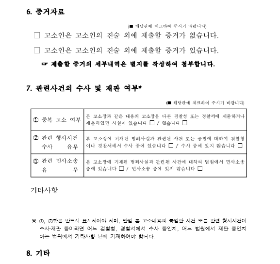 양식 2페이지를 보시면 3. 고소 목적 4. 범죄 사실 5. 고소 사유를 보실 수 있습니다. 이 부분이 민원의 가장 중요한 부분이라고 할 수 있습니다. 반면에, 많은 사람들이 이를 인지하지 못해서 틀리거나 실수를 하는 부분이기도 합니다. 우선, 고소 취지에 관하여, 고소인은 피고인이 ‘어떤’ 범죄를 저질렀는지 진술하고 기재해야 합니다. 이 경우 사기죄에 해당됩니다. 중요한 것은 상대방이 여러 유형의 범죄를 저질렀다면 그 범죄를 모두 나열하는 것이 좋다는 점이다. 다음으로, 범행의 사실관계나 고소 이유에 대해 잘 알지 못한다면 비슷한 내용이 반복되는 것처럼 느껴질 수 있는데 어떻게 적어야 할까요? 걱정하시는 분들이 많습니다. 이렇게 구별할 수 있습니다. 1) 범죄사실은 상대방(피고인)의 과실을 기술하는 부분입니다. 2) 고소 이유는 본인(고발인)이 피해를 입었다는 사실을 기재한 부분입니다. 즉, 상대방이 어떤 실수를 했는지, 그 실수가 사기죄에 해당하는지를 말합니다. 범죄사실에는 요건과 관련이 있다는 사실이 포함되며, 고소이유에는 고소인이 범죄로 인해 어떤 피해를 입었는지, 고소를 제기한 이유 등이 구체적으로 기재될 수 있다. 고소장 작성 시 주의할 점 3가지: 그런데 고소인이 법리를 오해해 ‘사기’라고 기재했는데 실제로는 또 다른 범죄에 해당한다면 어떻게 될까요? 이때 수사기관은 고소장을 ‘사기’ 혐의로 조사할 예정이며, 사건은 ‘혐의 없음’으로 종결될 예정이다. 실제로 고소를 하더라도 상대방을 처벌하는 수준까지 진전되지 않는 경우가 많다. 통계적으로 볼 때, 검찰이 기소하는 사건은 전체 사건의 1/4에 불과합니다. 이렇게 많은 사건이 기소되기 전에 종결되는 데에는 여러 가지 이유가 있지만, 그 중 하나는 서면 고소장이 부족하다는 것입니다. 즉 ‘사기 당했다’고 생각할 수도 있는데, 그 이유를 확인해 보면 그 이유를 알 수 있을 것입니다. ‘그 사람이 거짓말을 해서 내가 피해를 입었다’는 아주 단순한 경향에 따른 판단일 수도 있다. 사기 성립을 위한 법적 요건에 대한 전문가의 판단을 받지 않고서는 도달한 결론의 결과를 일반 대중이 확신하기 어렵습니다. 따라서 사기 고소장을 작성할 때에는 피해 복구를 위해 최소한 아래의 3가지 주의 사항을 준수하는 것이 중요합니다. 사기의 가능성이 높아지니 주의하시기 바랍니다. 사기범죄가 성립하기 위한 요건을 숙지하고, 요건에 따라 고소장을 작성하는 것이 좋습니다. 민원양식에 증거를 첨부하는 것은 선택사항으로 보이지만 ‘무조건’ 제출해야 합니다. . 무의미한 데이터를 많이 제출하는 것보다는 위의 요건을 충족하는 데이터를 선택하는 것이 좋습니다. 본인의 감정이나 성장과정 등 사건과 관련되지 않은 내용은 서류심사를 지연시킬 뿐입니다. 범죄와 관련된 부분과 그로 인해 입은 피해를 6하원칙에 따라 간결하게 작성하는 것이 좋습니다. 사기신고 양식과 주요사항 작성방법, 3가지 주의사항에 대해 알려드렸습니다. 아마도 여러분은 직접 고소장을 작성해 경찰에 제출하겠다는 마음으로 이 글을 읽기 시작했을 것입니다. 민원이 단순하기 때문에 앞으로의 일은 수사기관에서 다 알아서 하게 되는데… 하지만 현실적으로 민원은 그리 간단하지 않고, 수사기관이 ‘처리’하지 않는 것이 현실이라는 것을 아셔야 할 것입니다. ‘ 모든 것. 실제로는 사기를 당한 상황에서 고소가 이뤄지는 상황이다. 첫 번째로 취하는 방법이자 법적 절차의 출발점이라고 할 수 있습니다. 불만 사항을 제기했다고 해서 사건이 끝나는 것은 아닙니다. 이후의 모든 피해 복구 절차를 완료한 후에만 사건이 종료됩니다. 그 기간은 생각보다 짧지 않습니다. 결론을 내리기까지는 최소 6개월이 걸린다. 또한, 향후 법적 절차에 대응할 준비도 해야 합니다. 이 때문에 고소장 접수 단계부터 변호사의 도움을 받는 분들도 계십니다. 이미 유사한 사건을 경험했거나 관행에 익숙한 사람들이 이 방법을 선택합니다. 물론 선택은 당신의 것입니다. 잘 생각해 보시고, 실제로 고소장을 작성하신 후, 스스로 진행해야 할지, 아니면 변호사의 도움을 받아야 할지 고민해 보시기 바랍니다. 이것으로 기사를 마칩니다. 감사합니다. 사기 민원 작성법을 찾는 분들을 위한 추가 정보 사기 대응 매뉴얼, 민원부터 소송까지 ▼ 사기 대응 매뉴얼, 민원부터 소송까지 경제 상황이 어려워지면서 곳곳에서 사기 사건이 만연하고 있습니다. 전세사기, 투자사기, 폰지부터 시작해서… blog.naver.com 변호사채용비용, 대표Q&A ▼ (비용) 변호사채용비용 투명공개 + 대표Q&A 비… blog.naver.com