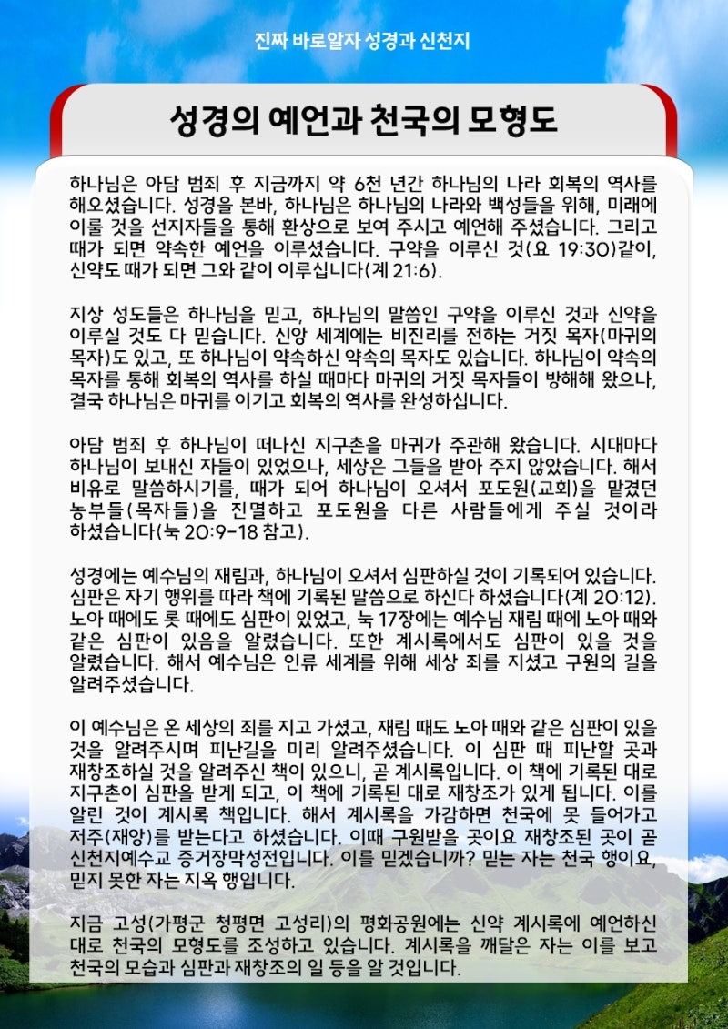 예수님의 십자가 죽으심과 부활하심은 성경에 미리 예언되어 있었기 때문에 예수님께서 모든 것을 이루신 것은 성경에 기록된 하나님의 말씀이 사실임을 증명하는 방법이었습니다. 그러나 예수님의 아들이라고 해서 십자가에 못 박히는 것이 고통스럽지 않다는 뜻은 아닙니다. 육신으로 오셨기 때문에 우리 인간이 느끼는 모든 두려움과 고통, 고난을 다 느끼셨고, 고난의 십자가를 지신 것은 오직 하나님의 말씀을 이루시고 죄인들을 죄에서 구원하시기 위한 예수님의 선택이었습니다. 그러나 그것이 끝이 아니었고 그것은 구약성서였습니다. 약속은 어린 양의 피로 하신 것이지만, 새 언약은 어린 양으로 오신 예수님의 피로 세우신 것입니다. = 새 언약이 이루어졌고, 예수님께서 승천하신 후부터 오늘날까지 사람들은 새 언약의 말씀을 이해하고 지키며, 예수님의 피로 세우신 새 언약으로 천국에 갑니다. 이것이 언약의 목적이요 의미였습니다. 그런데 사람들은 예수님, 십자가, 구원이라는 말만 좋아합니다. 그들은 예수님께서 십자가에 달려 세우신 새 언약에는 관심이 없습니다. 새 언약은 계시록이고, 계시록은 성취되어 드러났다. 이 땅의 모든 사람은 새 언약 안에 있습니다. 관찰하고 실천하는 것이 천국 가는 조건이자 길이다(계 22:18-19 참고). 천국에 가는 길은 좁고 좁은 길입니다. 누군가가 천국에 간다고 해서 천국에 가는 것은 아닙니다. 주인은 하나님이시며, 계시록에 가감하면 천국에 갈 수 없다고 하셨습니다. 그러므로 계시록을 하나님 뜻대로 알지 못하면 천국에 갈 수 없습니다. 신천지는 천국 가는 조건인 계시록의 예언과 성취를 증거하고 있다. 그렇기 때문에 신천지의 말씀을 듣고 확인해 보시길 바랍니다. 아담 범죄 후 하나님의 회복의 역사: 네이버 카페 (naver.com) 아담 범죄 후 하나님의 회복의 역사 아담의 범죄 후 하나님의 회복의 역사 하나님은 천년 동안 하나님 나라 회복의 역사를 해 오셨습니다. 하나님께서는 각 시대마다 수많은 선지자와 사도들을 이 땅에 보내셨습니다…. Cafe.naver.com 2023 신천지 12지파 10만 졸업식 하이라이트(6분) | 신천지예수교회(youtube.com) 성경통해하기 http://bit.ly/2q8Hvuz 신청번호 020111