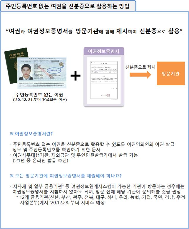 새 여권에는 주민등록번호 마지막 자리가 적혀 있지 않기 때문에 여권만으로는 신분증 역할을 할 수 없다. 신분증으로 제시할 주민등록번호 마지막 자리와 여권정보가 기재된 ‘여권정보증명서’를 제시해야 합니다.