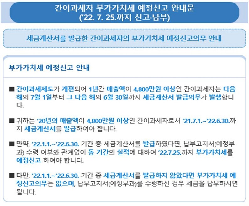간이납세자의 경우 과세기간은 1년입니다. 과세기간은 1월 1일부터 12월 31일까지이고, 신고 및 납부기간은 다음 연도까지 적용되어 1월 1일부터 25일까지 하시면 됩니다. 다만, 7월 1일부로 과세방식을 전환한 사업자와 과세예정기간 중에 세금계산서를 발행한 간이납세자의 경우 과세기간은 1월 1일부터 6월 30일까지이다. 따라서 7월 25일까지입니다. 신고하고 납부해야 합니다.
