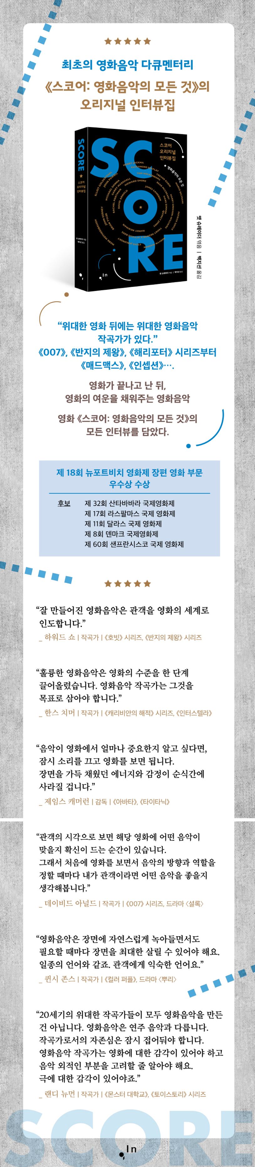 참고 : https://blog.naver.com/ghost0221/221283931043 다큐멘터리 ‘스코어’가 아주 인상적이었습니다. 저는 영화를 좋아하지만 영화음악에 대한 이해(듣기)나 지식이 너무 단순해서(유명 작곡가의 이름만 아는 것만으로는) 부족하다는 걸 뼈저리게 느꼈습니다. 그리고 좀 더 부끄러운 말을 해야 할 것 같습니다. 봤음에도(알면서도) 영화를 보면… 아직도 음악이 잘 들리지 않는 것 같다. 그런 면에서 저는 아직 영화에 대해 잘 모르는 것 같아요. 언제쯤 영화를 조금이라도 알아갈 수 있을까요? 꼭 알아야 할 내용은 아니더라도 말이죠. “악보는 악보를 뜻해요. 영화음악에서는 악보를 사용하여 음악을 연주하므로 영화음악을 악보라고 합니다. “이 책은 각종 영화제에서 수상한 <스코어: 영화음악의 모든 것>의 첫 번째 영화음악 다큐멘터리이자 오리지널 인터뷰 모음집으로, 영화 속 인터뷰 대상자들의 심층 인터뷰를 담고 있습니다.” 다큐멘터리를 만들기 위해 진행한 인터뷰에서 (아마도) 생략된 아쉬운 내용을 책으로 최대한 많은 분들께 알리고자 이 책을 만든 것은 아닐까? 다큐멘터리를 좋아했다면 이 책도 나쁘지 않을 것이다. 다양한 작곡가/음악가들과의 인터뷰가 좀 더 자세하게 담겨 있어서 읽는 재미가 있었고, 다큐멘터리에서 보았던 내용을 다시 읽어보며 새로운 이해를 얻을 때도 있었습니다. 재미있게 읽었고 영화에 대해 더 많이 알 수 있게 되었어요. 그런데, 알려준다고는 하지만, 다 받아들일 능력이 있는지는 모르겠습니다. 아직 모르는 게 너무 많아요. “시대가 바뀌면서 영화음악을 제작하는 방식도 바뀌었어요. 이 책은 배경음악에 불과했던 영화음악이 이제 영화팬들에게 음악으로 사랑받을 수 있도록 거장들의 음악적 시도를 자세하게 소개하고 있다. 영화의 배경 지식을 이해하기 위해 녹음을 위해 세계를 여행하거나, 독특한 소리를 얻기 위해 의도적으로 조율이 맞지 않는 피아노를 사용하거나, 원하는 하프 사운드를 만들기 위해 오래된 피아노를 거대한 에올리안 하프로 만들어서 녹음하는 것 등이 있습니다. 등 파격적인 작업 방식과 새로운 변화를 추구하는 모습이 영화음악 작업 방식에 대한 독자들의 호기심을 자극한다. 클래식, 대중음악 등 장르에 국한된 다른 분야의 작곡가들과 달리, 영화음악 작곡가들은 온갖 악기를 동원해 폭넓은 음악을 아우른다. “이런 종류의 영화음악의 제작과정은 정말 상상 그 이상입니다.” #ScoreOriginalInterviewCollection #Score #MatthewRader