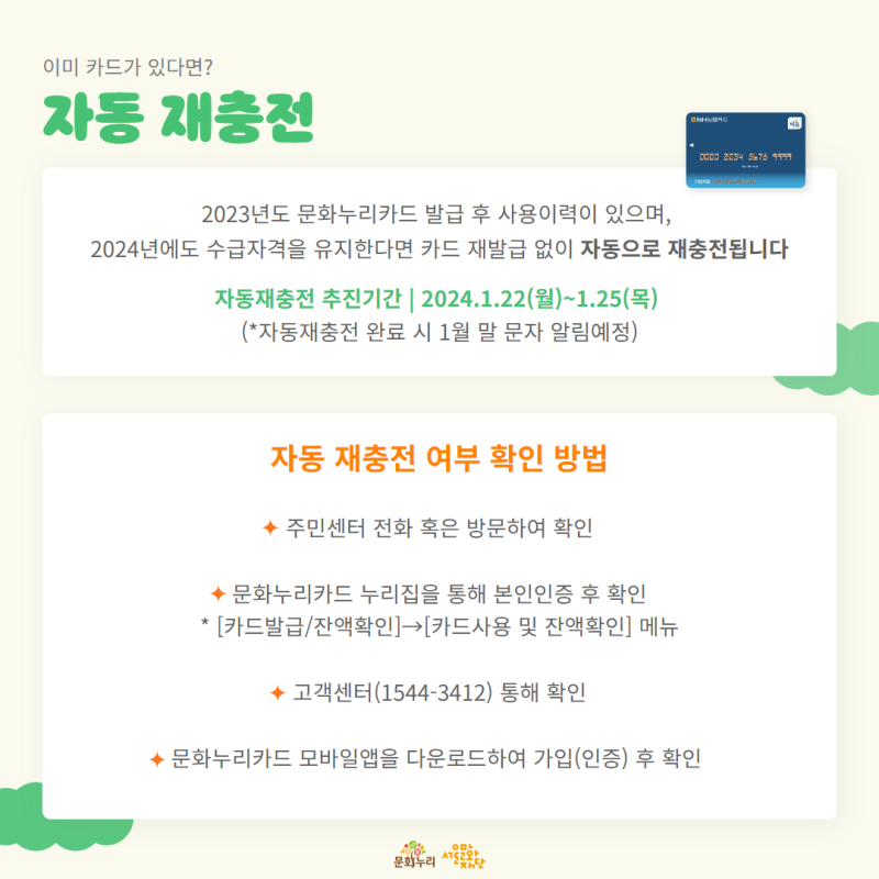 영화, 도서, 여행, 스포츠, 레저, 교육 등 활용 범위가 넓으며 온·오프라인 가맹점도 많습니다. 문화누리카드 1월 22일부터 25일까지 자동 충전